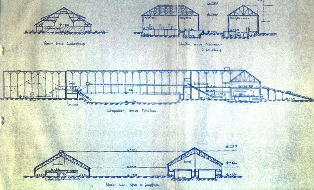 Schnitte durch das neuen Klinkerwerk Neuengamme. Abrechnungszeichnungen der Deutschen Erd- und Steinwerke GmbH (DESt). Plan: unbekannt, nicht datiert. (ANg)