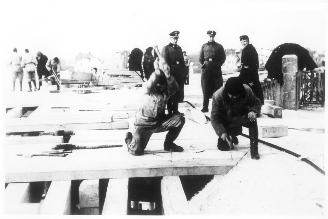 KZ-Häftlinge bei Schalungsarbeiten auf der Baustelle des neuen Klinkerwerks. Foto: unbekannt, nicht datiert. (USHMM)
