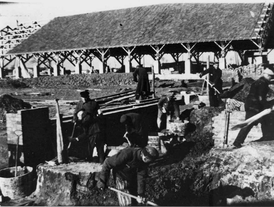 KZ-Häftlinge bei Ausschachtungsarbeiten für das neue Klinkerwerk. Im Hintergrund wird das Bauprinzip erkennbar. Zuerst werden die Fundamentsockel gebaut und dann der Dachstuhl errichtet und mit Dachpfannen gedeckt. Erst zum Abschluss werden die Außenwände errichtet. SS-Foto, nicht datiert. (ANg)