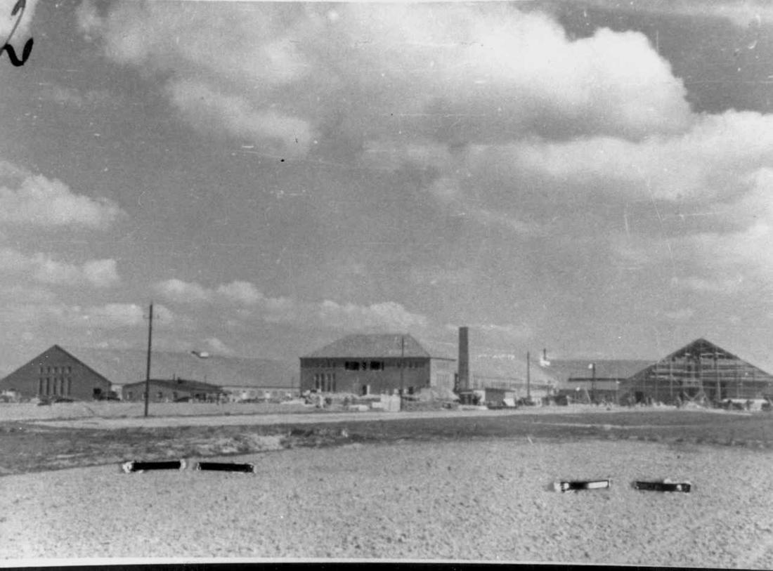 Südöstliche Ansicht der Baustelle des neuen Klinkerwerks. Der westliche (linke) und der mittlere Flügel sind bis auf die Fenster fertig errichtet. Bei dem östlichen (rechten) Flügel wird der Giebel noch aufgemauert. SS-Foto, nicht datiert. (TNA (PRO))