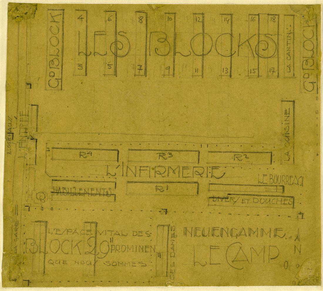 Lageplanskizze des „Schutzhaftlagers“ (Häftlingslager). Bleistiftzeichnung des ehemaligen Häftlings des KZ Neuengamme Lazare Bertrand, nicht datiert. (MOL)