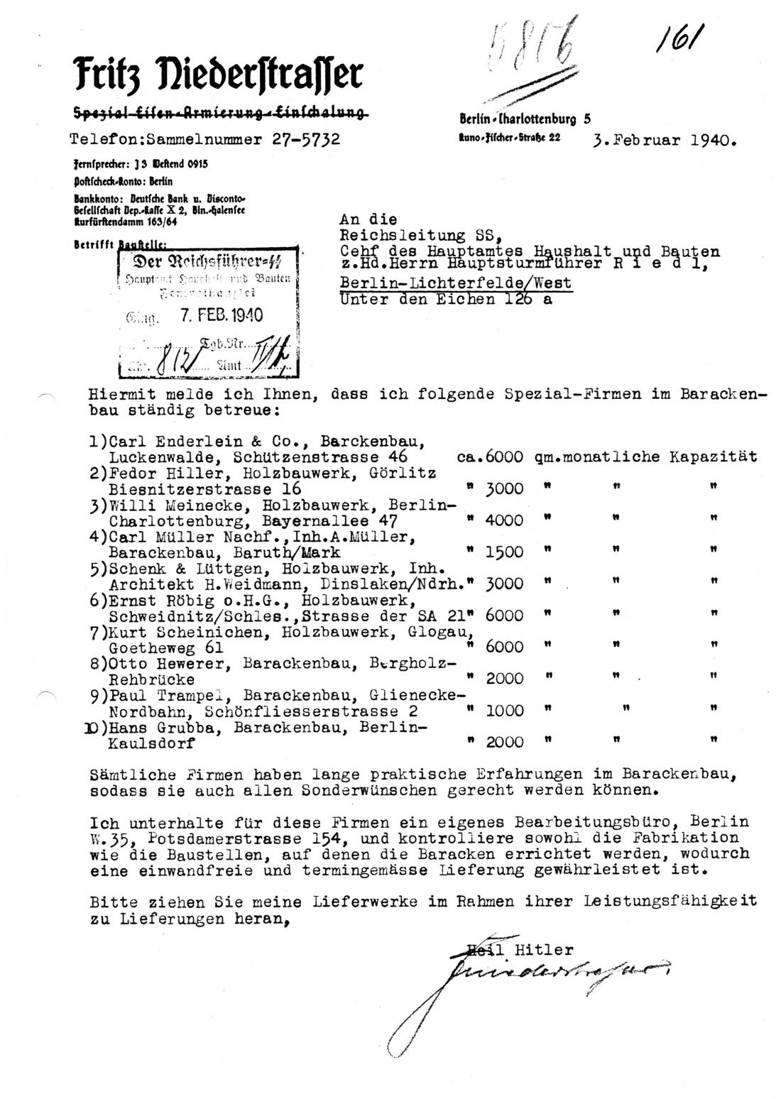 Meldung von Fritz Niederstrasser an den Chef des SS-Hauptamtes Haushalt und Bauten, SS-Hauptsturmführer Riedl, über die von ihm betreuten Barackenbaufirmen, 3.2.1940. (StBG/MGR)
