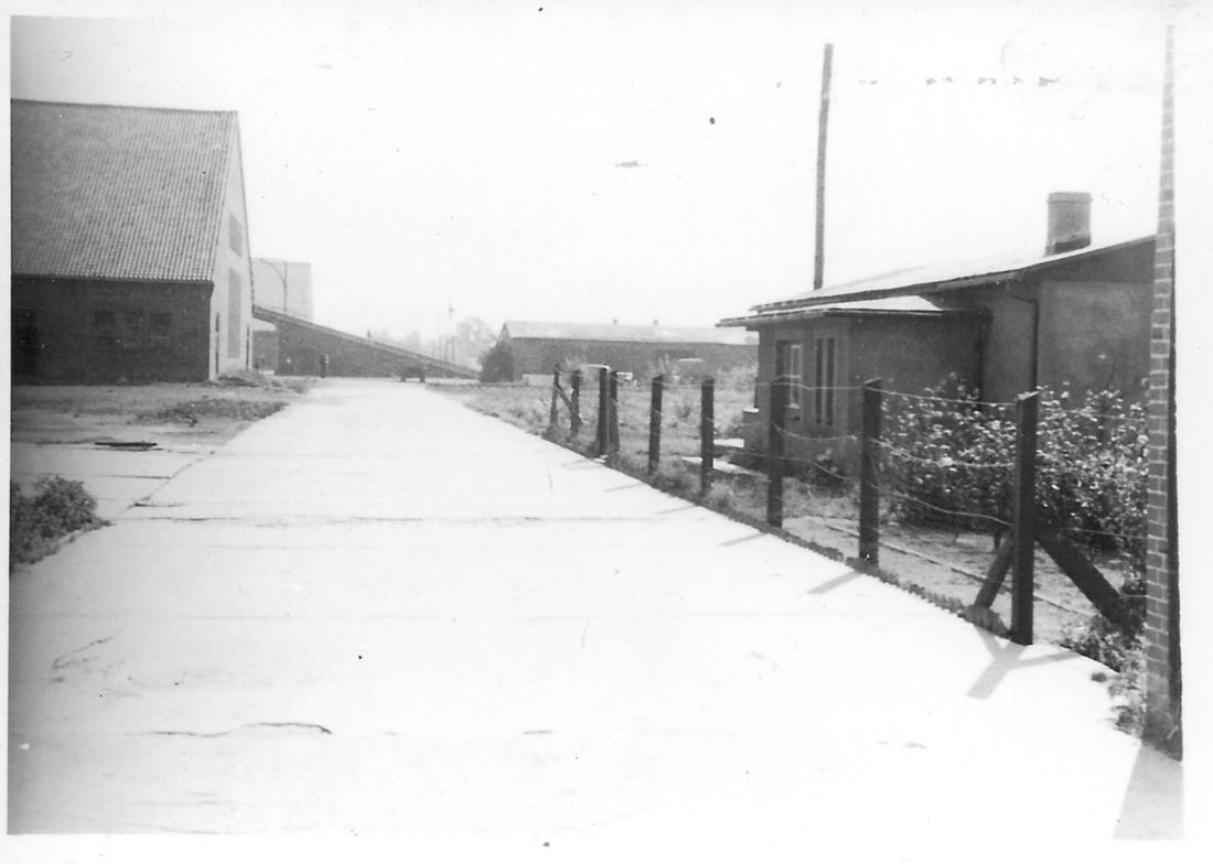 Zufahrt zum neuen Klinkerwerk. Zu erkennen sind die großen Betonplatten. Rechts ein Plattenhaus, in dem die Bauleitung der Deutschen Erd- und Steinwerke GmbH (DESt) untergebracht war. Foto: unbekannt, nicht datiert (Nachkriegsaufnahme). (ANg)