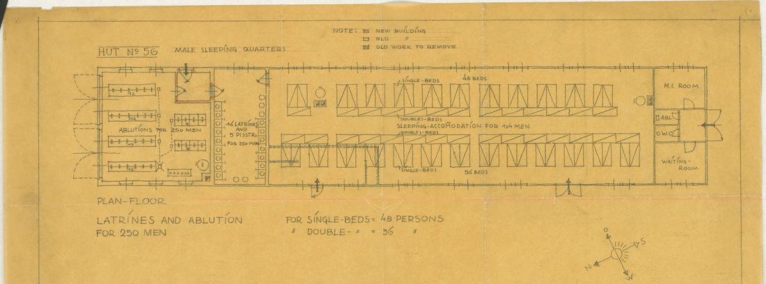 Britischer Grundriss der Werkstattbaracke 2 (Tischlerei) mit den geplanten Umbauten und der Bettenaufteilung in der als Interniertenunterkunft genutzten Baracke. Plan: Deputy Commander Royal Engineers, Work Section 218, nicht datiert. (ANg)