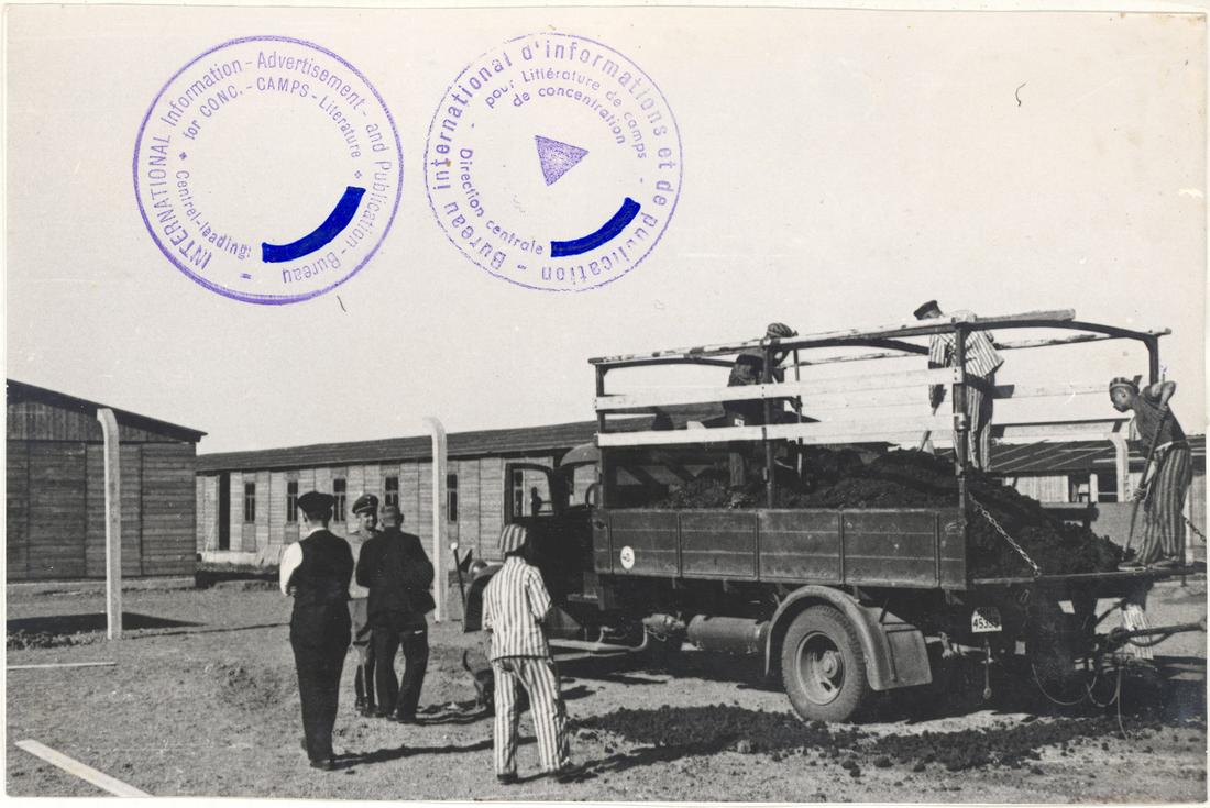 KZ-Häftlinge entladen im SS-Lager einen Lkw mit Schlacke. Im Hintergrund sind die noch im Rohbau befindlichen Häftlingsbaracken zu erkennen. Der Zaun hat noch keine Stacheldrahtbespannung. SS-Foto aus dem so genannten Masset-Album, nicht datiert. (ANg)
