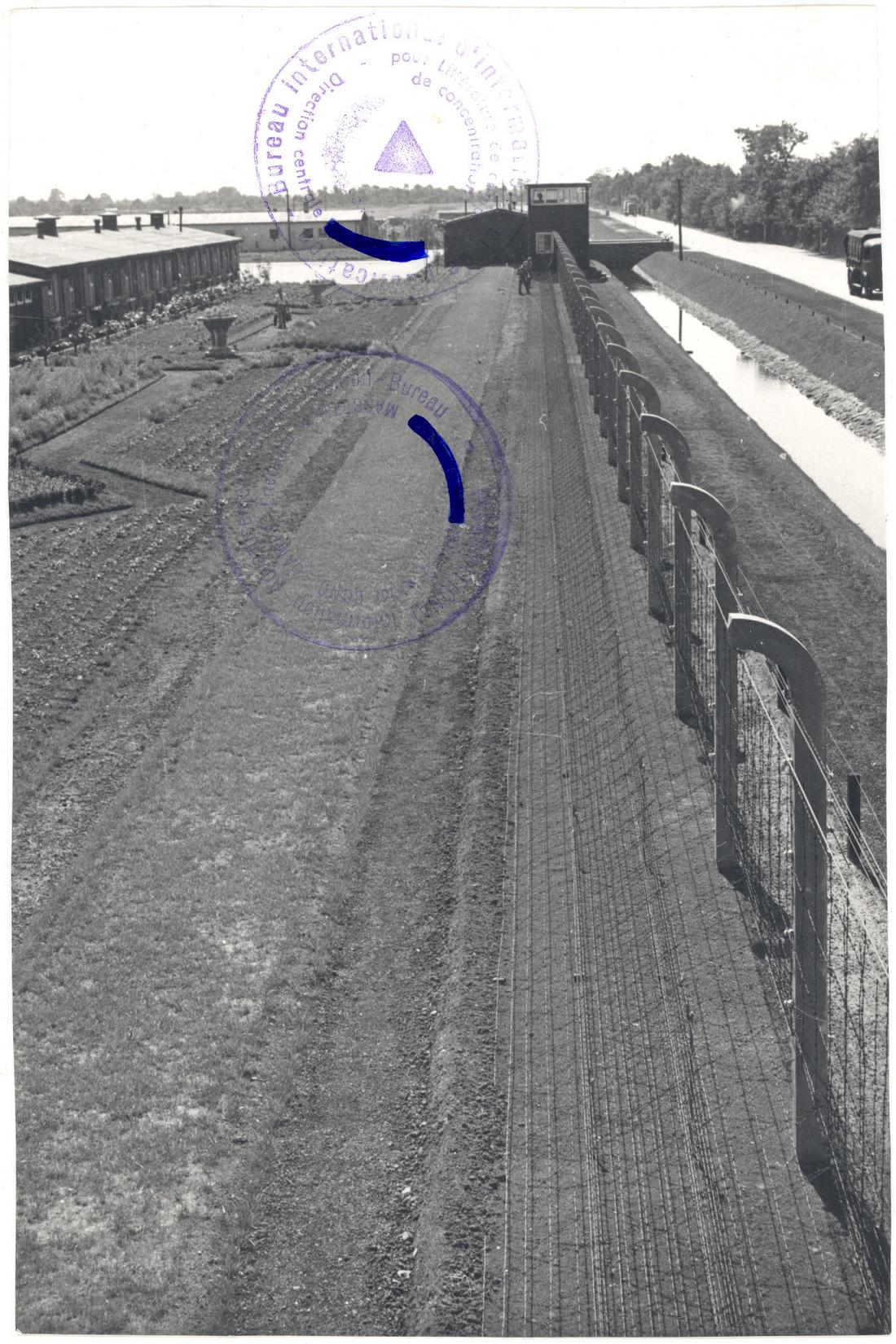 Blick entlang des Lagerzauns in Richtung des Eingangs des „Schutzhaftlagers“ (Häftlingslager). Links ist die 1944 abgerissene Häftlingsbaracke 1 zu erkennen. SS-Foto aus dem so genannten Masset-Album, nicht datiert. (ANg)