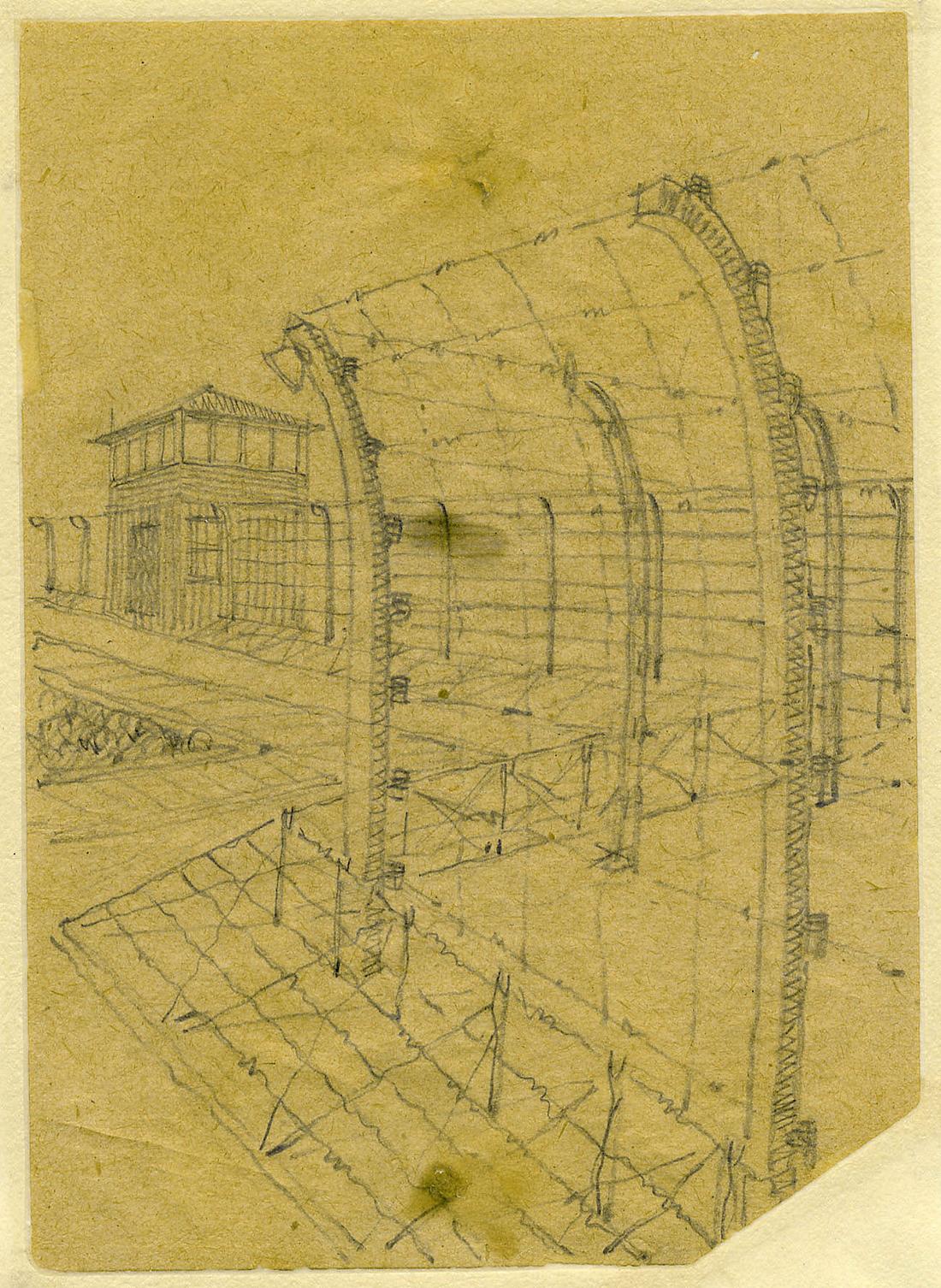 Zaunanlage. Bleistiftzeichnung des ehemaligen Häftlings des KZ Neuengamme Lazare Bertrand, nicht datiert. (MOL)