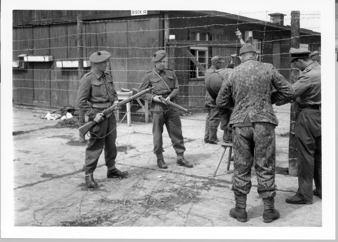 Internierte SS-Männer errichten unter der Bewachung der britischen Soldaten Lance Bombardier Sanders (links) und Lance Bombardier Blanchard einen zusätzlichen Zaun auf dem Appellplatz vor den Unterkunftsbaracken. Foto: unbekannt, Mai 1945. (BA BDC)