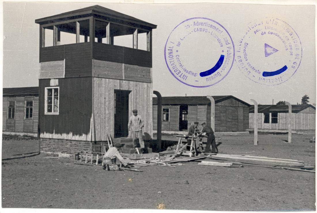 KZ-Häftlinge beim Aufbau eines hölzernen Wachturms zwischen dem Schutzhaftlager (Häftlingslager) und dem SS-Lager. Im Hintergrund stehen Unterkunftsbaracken im Rohbau. SS-Foto aus dem so genannten Masset-Album, nicht datiert. (ANg)