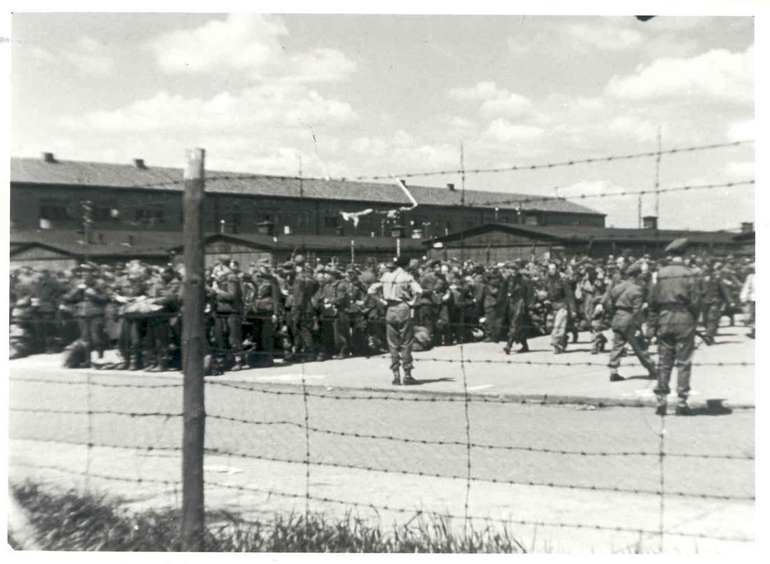 Der Appellplatz im britischen Internierungslager CIC 6. Im Hintergrund sind die Unterkunftsbaracken und links das westliche Klinkergebäude zu erkennen. Foto: unbekannt, nicht datiert (Nachkriegsaufnahme). (ANg)