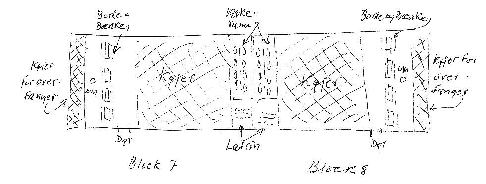 Lageplan der Häftlingsbaracken 7 und 8. Zeichnung des ehemaligen Häftlings des KZ Neuengamme Arne Andreasens, nicht datiert. (Privatbesitz Andreasens)