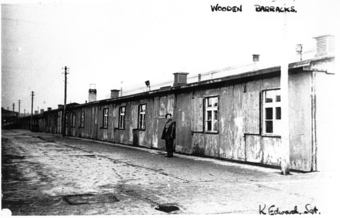 Ansicht einer Unterkunftsbaracke. Im Vordergrund ist ein 2 m breiter Betonplattenweg zu erkennen. Foto: unbekannt, nicht datiert (Nachkriegsaufnahme). (TNA (PRO))