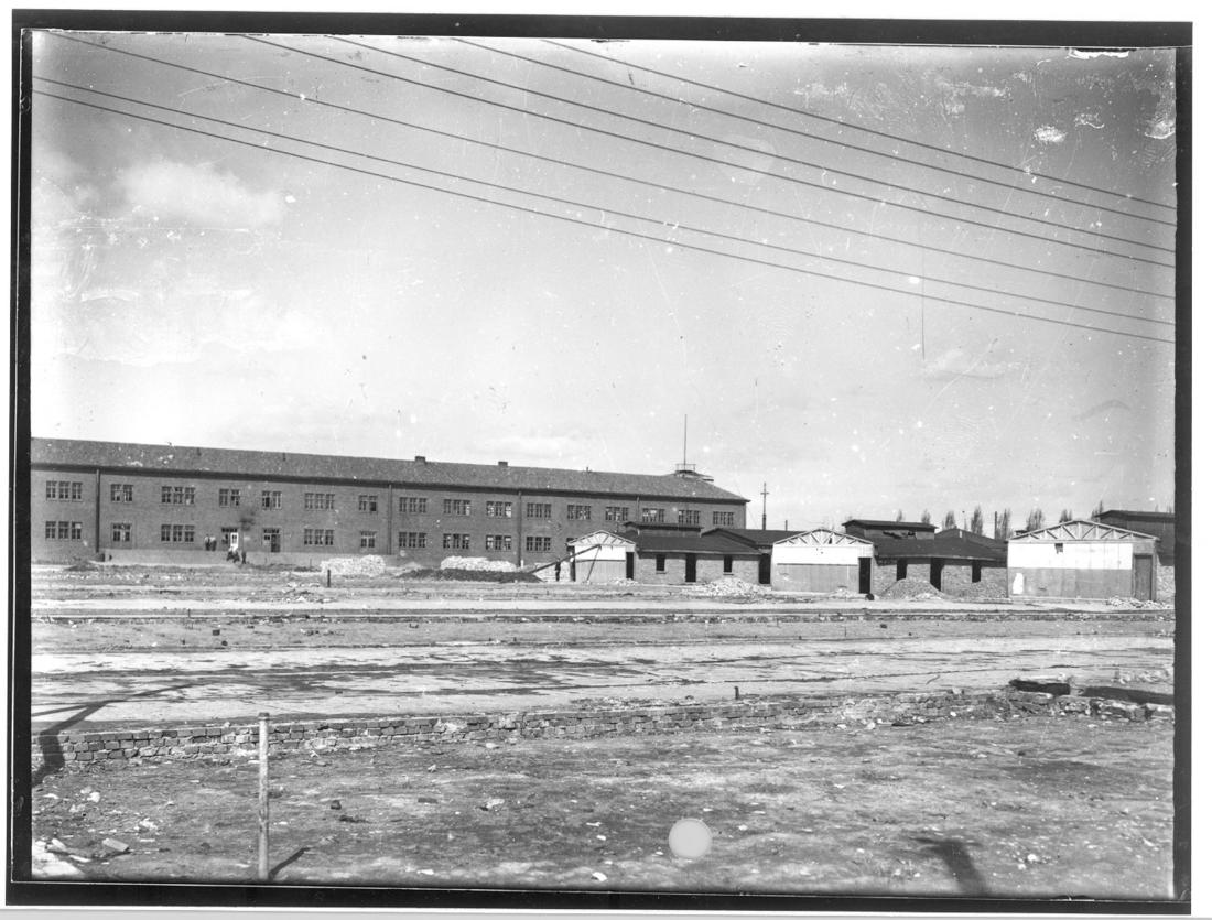 Ansicht des westlichen Klinkergebäudes mit der Freitreppe, die in das Gebäude führte. Im Vordergrund sind erste abgerissene Unterkunftsbaracken zu erkennen. Foto: Hamburg Strafvollzugsamt, vermutlich 1949. (ANg)