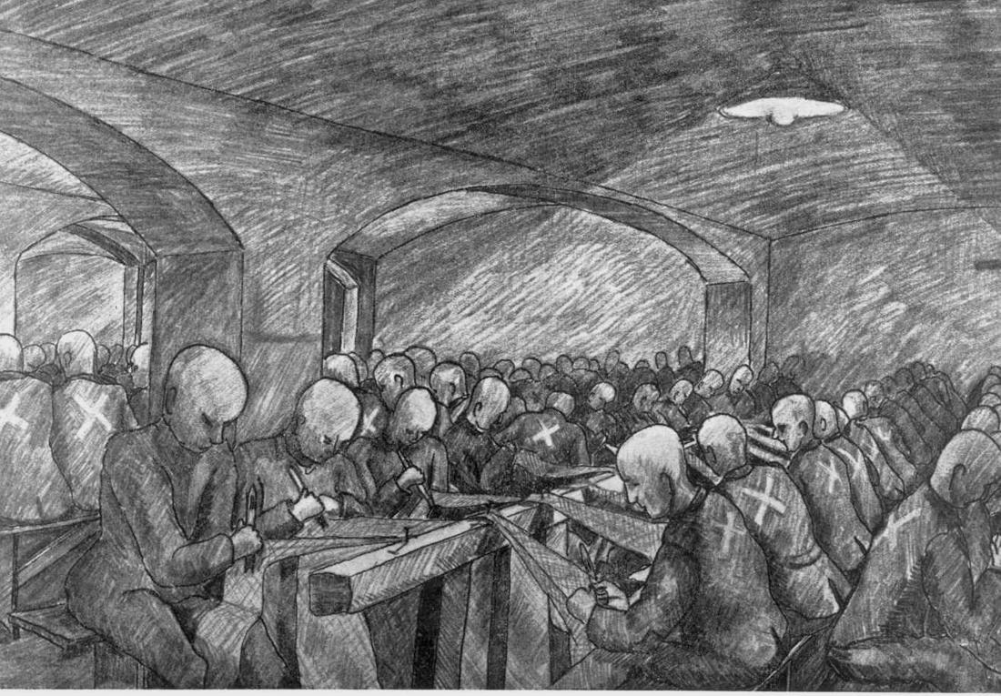 Flechtarbeiten eines „Schonkommandos“ im Keller eines Klinkergebäudes. Bleistiftzeichnung des ehemaligen Häftlings des KZ Neuengamme Hans Peter Sørensen, nicht datiert. (ANg)