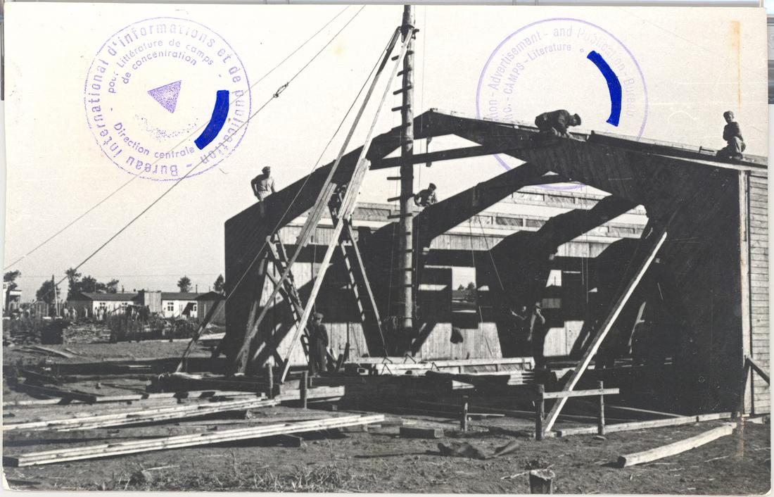 Aufbau der Häftlingsküche. Im Hintergrund sind Unterkunftsbaracken und Bäume am Neuen Heerweg (heute Jean-Dolidier-Weg) zu erkennen. SS-Foto aus dem so genannten Masset-Album, nicht datiert. (ANg)
