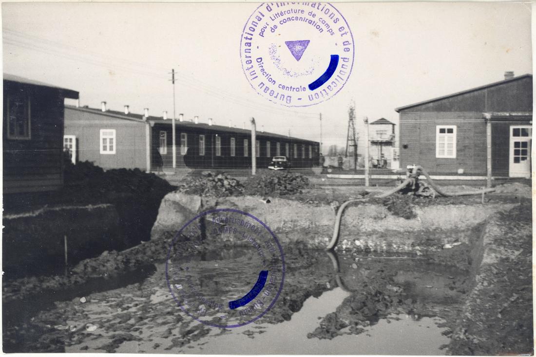 Ausschachtungsarbeiten für den Keller der Häftlingskantine. Mit einer Pumpe wird die Baugrube trockengelegt. Im Hintergrund ist links eine SS-Unterkunftsbaracke und rechts die SS-Kantine zu erkennen. SS-Foto aus dem so genannten Masset-Album, nicht datiert. (ANg)
