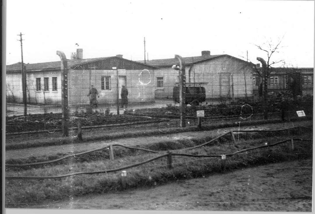 Ansicht der Effektenkammer (links) und der parallel dazu stehenden Häftlingsschneiderei. Foto: unbekannt, Mai 1945. (Privatbesitz Jaqueline Dumortier-Bibauw)