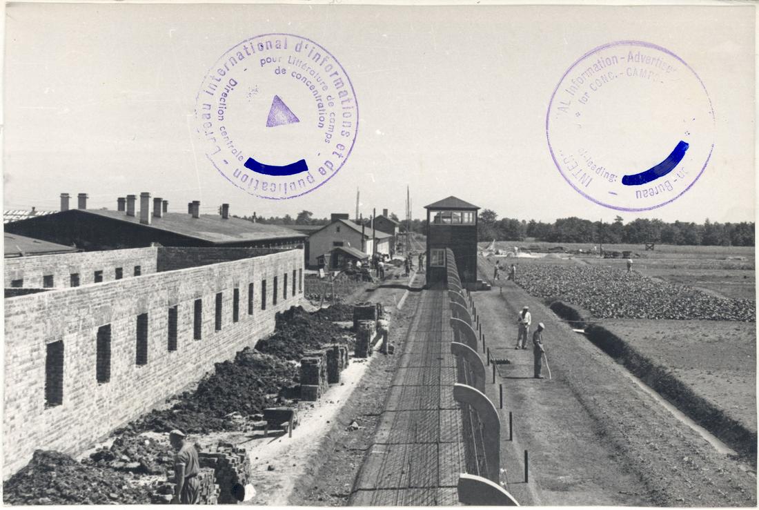 Maurerarbeiten an der Kleiderkammer. Rechts befindet sich das noch unbebaute Gelände des späteren Sonderlagers für französische Prominente. Im Hintergrund sind an die Häftlingsschneiderei angrenzend das Krankenrevier und dahinter die Leichenkammer zu erkennen. SS-Foto aus dem so genannten Masset-Album, nicht datiert. (ANg)