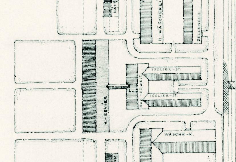 Lageplanentwurf einer Erweiterung des Krankenreviers. Ausschnittvergrößerung. Im rückwärtigen Bereich sollten zwei schmale Baracken eine Isolierstation aufnehmen. Plan: Amtsgruppe C im SS-Wirtschafts-Verwaltungshauptamt, 3.3.1942. (CChIDK)