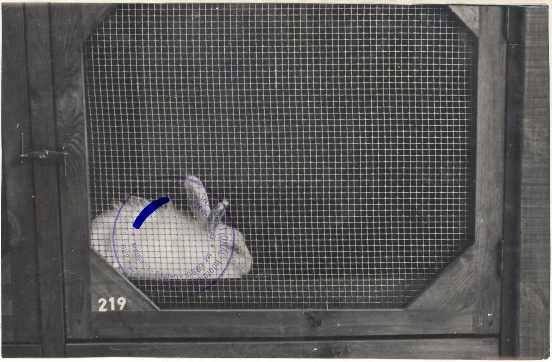 Blick in den Einzelkaninchenstall Nr. 219 mit einem Angorakaninchen. SS-Foto aus dem so genannten Masset-Album, nicht datiert. (ANg)