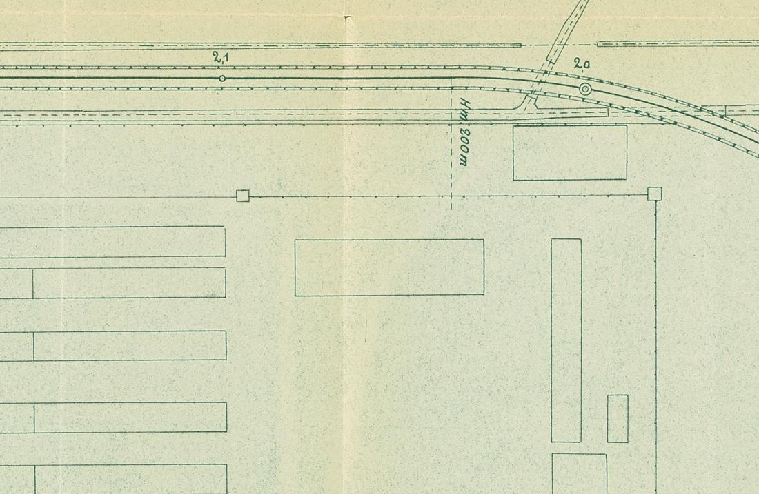 Auszug aus der Planungsgrundlage für einen Gleisanschluss durch die Bergedorf-Geesthachter Eisenbahn AG (BGE). Oben rechts ist der Kaninchenstall eingetragen. Plan: BGE, April 1941. (ANg)