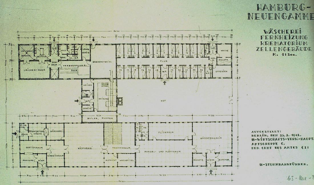 Entwurf eines Gebäudekomplexes mit Wäscherei, Fernheizung, Krematorium und einem Zellengebäude. Eine Wäscherei mit einer Entlausungsanlage war oben links geplant. Plan: Amtsgruppe C im SS-Wirtschafts-Verwaltungshauptamt, 25.2.1942. (CChIDK)