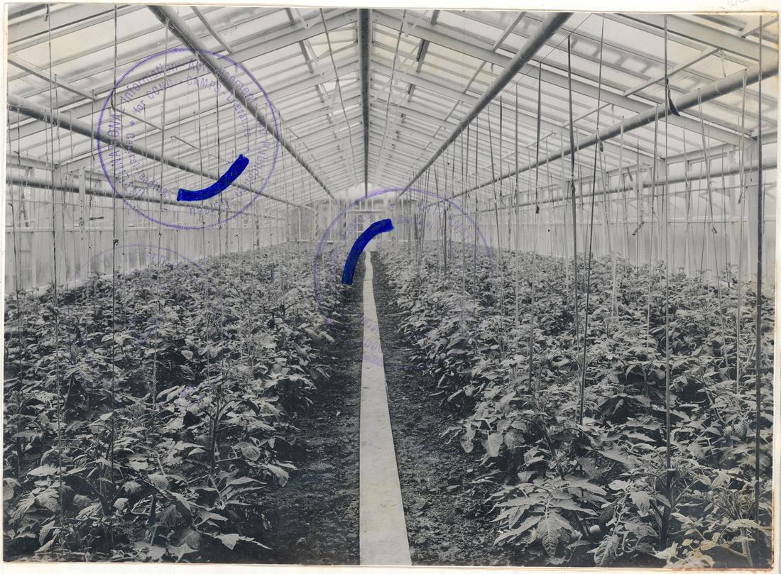 Blick in eines der Gewächshäuser. In der Mitte ist ein schmaler Plattenweg zu erkennen. SS-Foto aus dem so genannten Masset-Album, nicht datiert. (ANg)