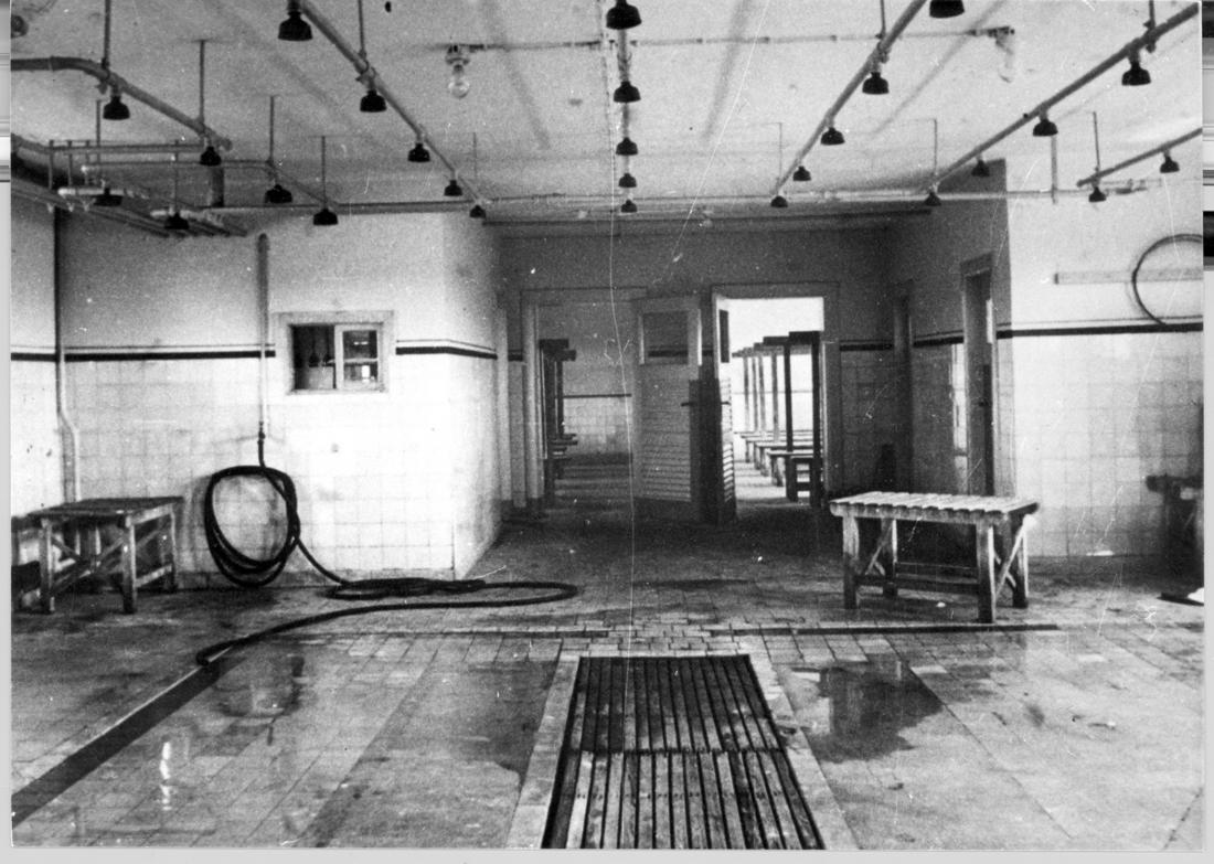 Der Gemeinschaftsduschraum im Häftlingsbad. Im Hintergrund sind zwei Umkleideräume zu erkennen. Foto: unbekannt, nicht datiert (Nachkriegsaufnahme). (ANg)