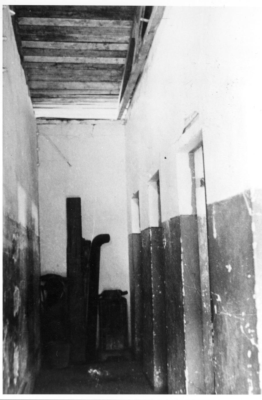 Blick in den Flur des Arrestbunkers (Lagergefängnis). Rechts vom Flur liegen die Zellen. Im Hintergrund Heizungsrohre, die bei der Erweiterung des Zellenbaus durch die britische Lagerverwaltung verlegt wurden. Foto: unbekannt, nicht datiert (Nachkriegsaufnahme). (ANg)