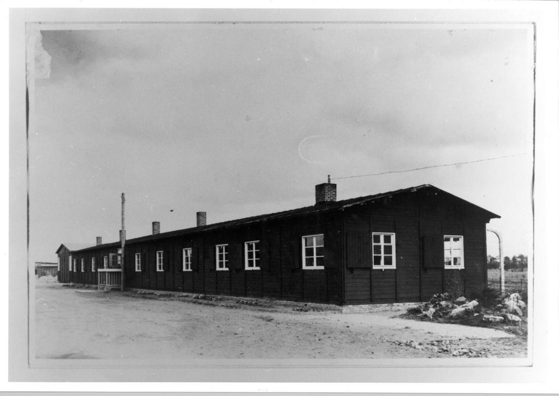 Verwaltungsbaracke am südlichen Rand des Geländes der Deutschen Ausrüstungswerke (DAW). In der Barackenmitte ist der mit zwei Brüstungen gestaltete Eingang zu erkennen. SS-Foto, nicht datiert. (TNA (PRO))