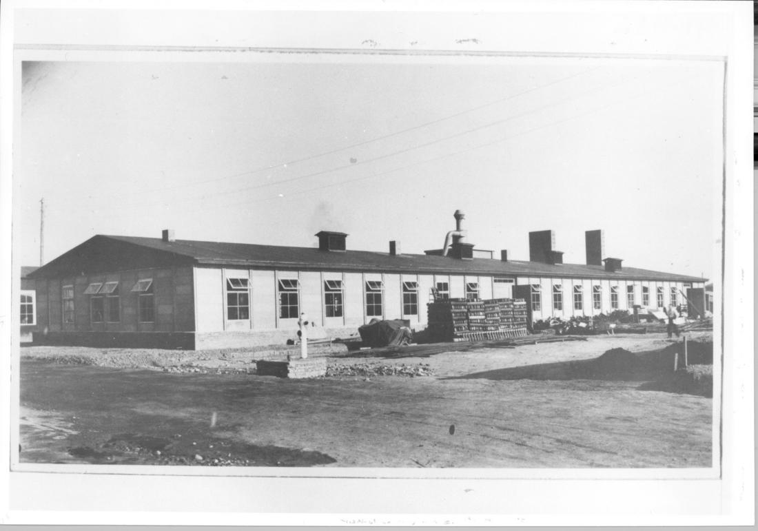 Ansicht der 9,56 m × 41,30 m großen Arbeitsbaracke III von Typ OKH 260/9, die als Tischlereibaracke genutzt wurde. SS-Foto, nicht datiert. (TNA (PRO))