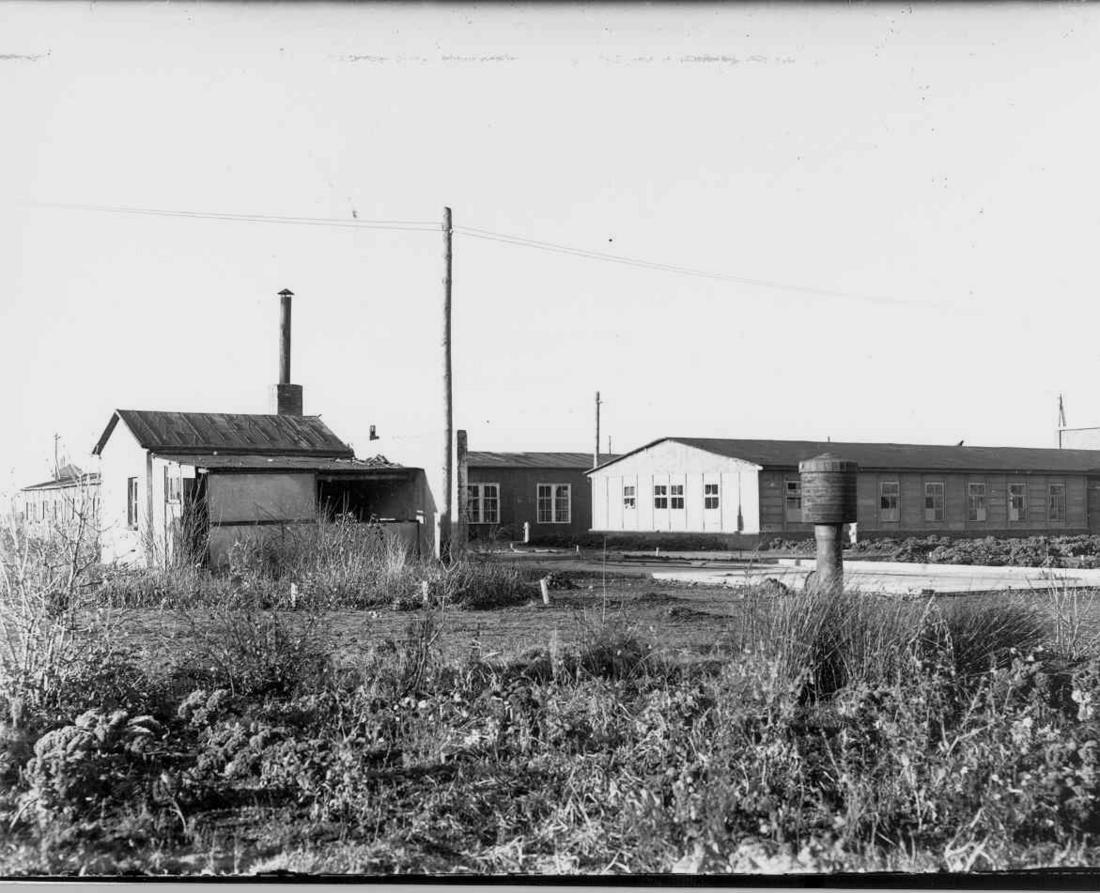 Östliche Ansicht des Produktionsstandortes der Deutschen Ausrüstungswerke (DAW). Im Vordergrund links ist eine kleine Abortbaracke und links dahinter die Verwaltungsbaracke zu erkennen. Rechts die Arbeitsbaracke III und in der Bildmitte die Arbeitsbaracke II. Foto: Strafvollzugsamt Hamburg, vermutlich 1948. (ANg)