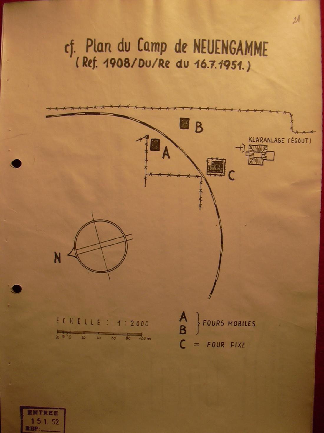 Lageplan mit den Standorten der drei Krematorien, die nacheinander im KZ Neuengamme existiert haben. Die Beschreibung der Krematorien ist allerdings nicht korrekt: Am Standort A stand das feste Krematorium und an den Standorten B und C die mobilen Provisorien. Plan: „Mission de Recherche“ der Amicale Internationale de Neuengamme, 15.1.1952. (Privatbesitz Renée Aubry)