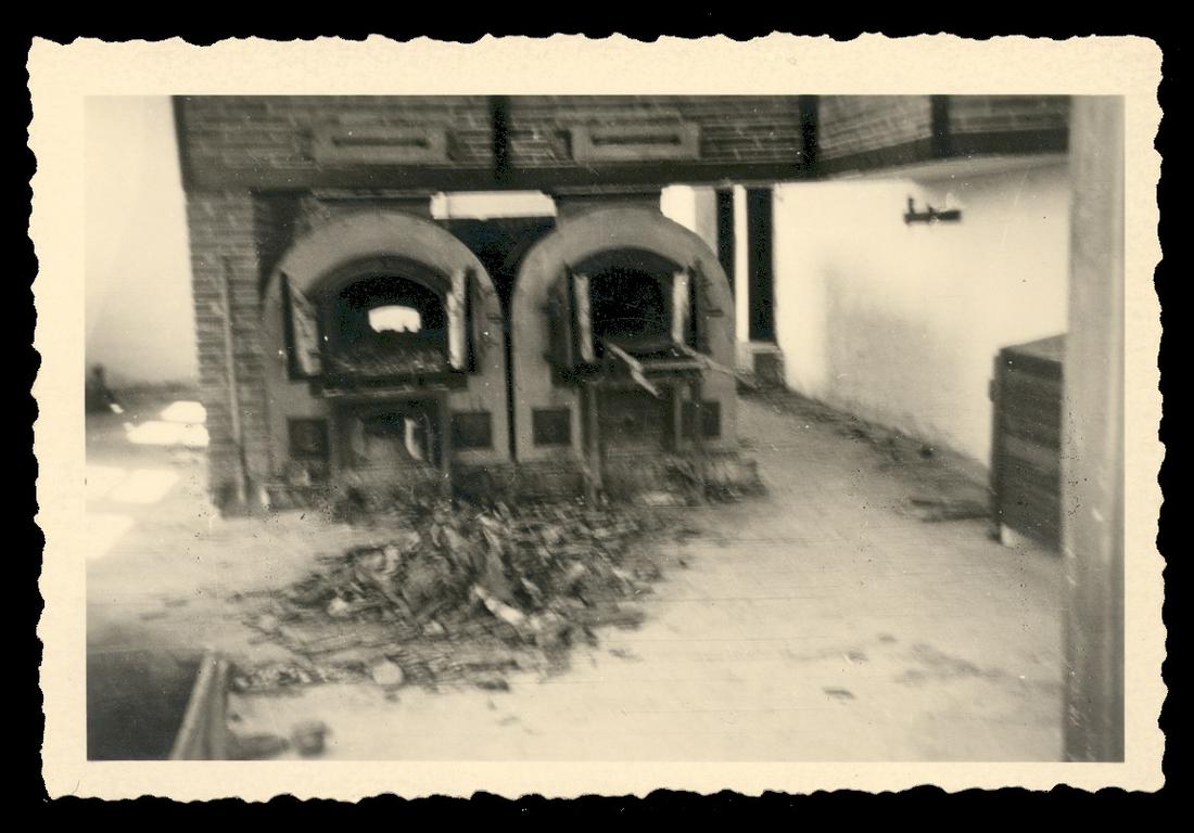 Ansicht der Verbrennungsöfen. Zu erkennen ist die kompakte Bauweise der Öfen, die als Einheit vor Ort aufgestellt wurden. Das massive Mauerwerk über den Öfen ist ein Rauchabzug. Foto: unbekannt, nicht datiert (Nachkriegsaufnahme). (Privatbesitz Dr. Salomon Berreklouw)