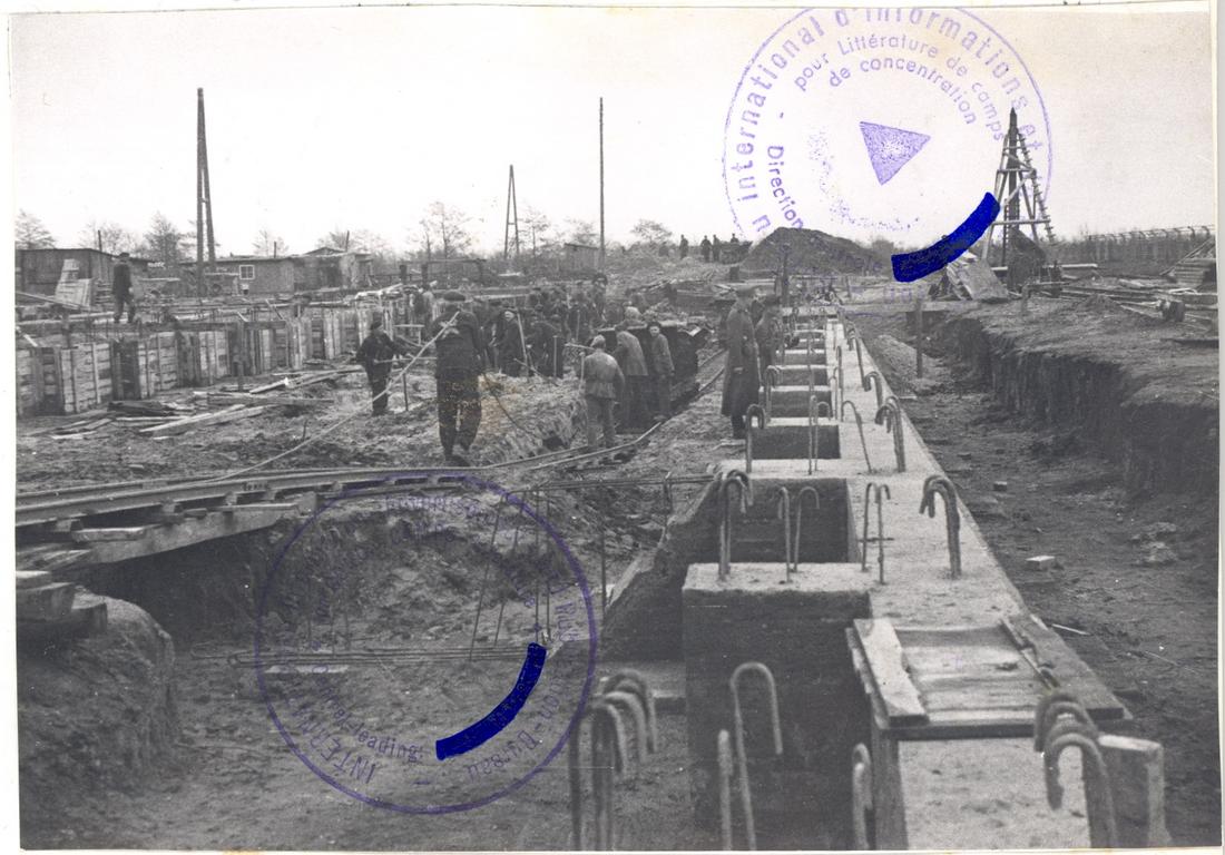 KZ-Häftlinge bei Fundamentierungsarbeiten an einem Flügel der Produktionshalle der „Metallwerke Neuengamme“ („Walther-Werke“). SS-Foto aus dem so genannten Masset-Album, nicht datiert. (ANg)