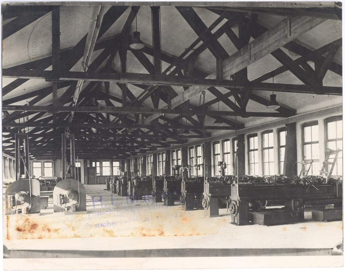 Blick in einen der Produktionsflügel der „Metallwerke Neuengamme“ („Walther-Werke“). Zu erkennen sind neun Drehbänke. SS-Foto aus dem so genannten Masset-Album, nicht datiert. (ANg)