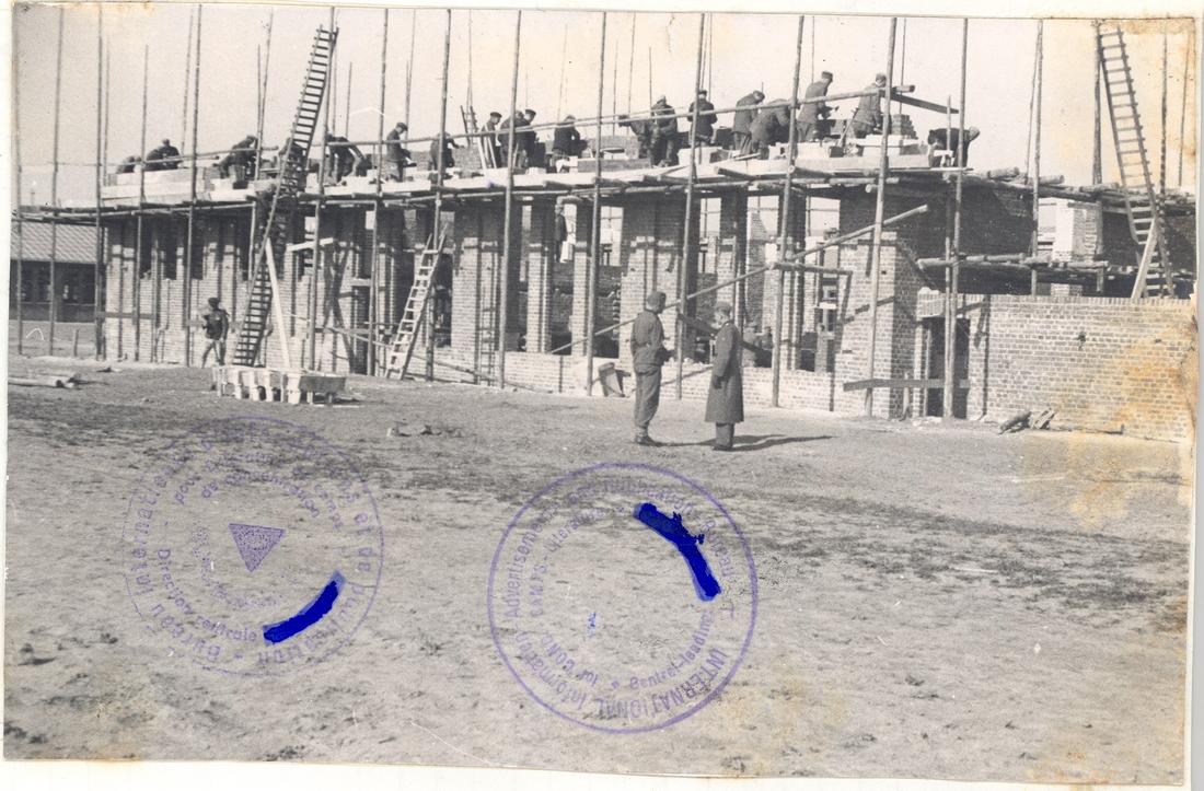 Rohbauarbeiten am Heizhaus. Im Hintergrund sind am linken Bildrand die auf dem nordwestlichen Querflügel der „Metallwerke Neuengamme“ („Walther-Werke“) angebrachten Dachlatten zu erkennen. SS-Foto aus dem so genannten Masset-Album, nicht datiert. (ANg)