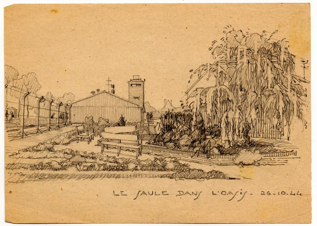 Die kleine, „Oase“ genannte Gartenanlage zwischen der Rapportführer-Baracke und dem Sonderlager für französische Prominente. Bleistiftzeichnung des ehemaligen Häftlings des KZ Neuengamme Lazare Bertrand, 26.10.1944. (MOL)