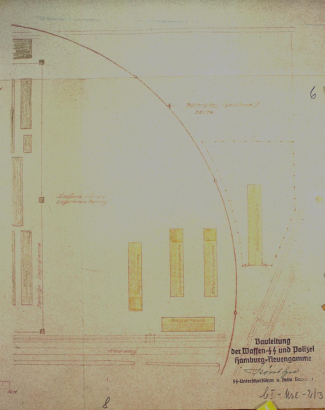 Lageplan des Industriehofes. Die gebogene Linie stellt das geplante Anschlussgleis dar. Rechts davon ist in einem abgezäunten Bereich ein Gebäude als „Kohlenschuppen“ eingetragen. Plan: Bauleitung der Waffen-SS und Polizei Hamburg-Neuengamme, nicht datiert. (CChIDK)