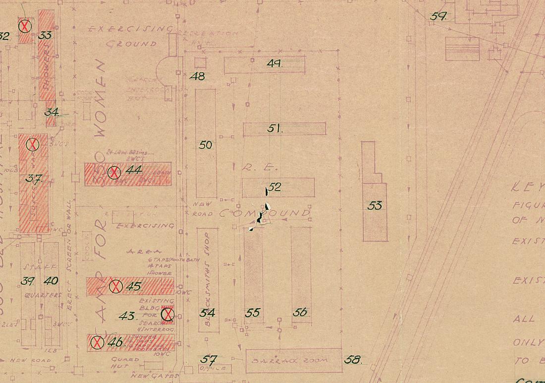 Auszug aus dem Lageplan des britischen Internierungslagers CIC 6. Der ehemalige Kohlenbunker wurde mit der Bestandsnummer 53 aufgelistet. Die Nutzung ist nicht bekannt. Plan: Deputy Commander Royal Engineers, Work Section 218, September 1945. (ANg)