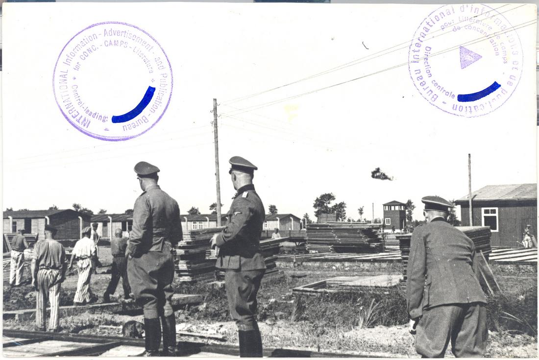 Aufbau des SS-Lagers. Rechts sind Rohbauten der ersten SS-Unterkunftsbaracken und links fertige Häftlingsunterkunftsbaracken zu erkennen. Im Vordergrund sind Bauteile der Normbaracken gestapelt. SS-Foto aus dem so genannten Masset-Album, nicht datiert. (ANg)