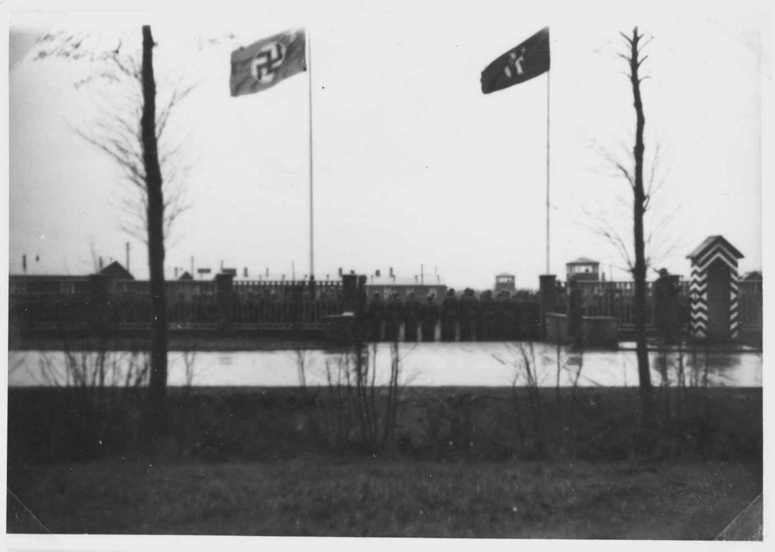 Der fertig gestellte Eingang in das SS-Lager bei einem SS-Appell. Lediglich die Fahnen mit den Hakenkreuz- und SS-Runen-Fahnen markieren den Eingang. SS-Foto, nicht datiert. (ANg)