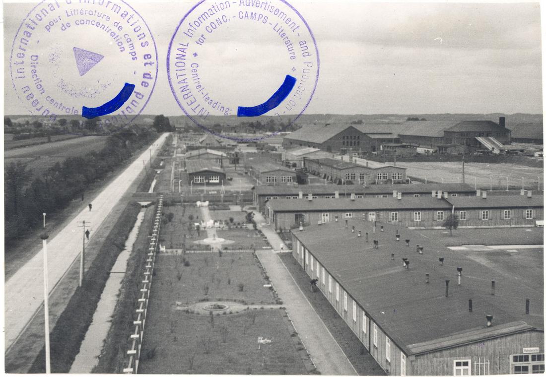 Überblick über das SS-Lager. Im Vordergrund rechts ist die Kommandantur zu erkennen. Zum links verlaufenden Neuen Heerweg (heute Jean-Dolidier-Weg) hin lag eine gestaltete Freifläche. SS-Foto aus dem so genannten Masset-Album, nicht datiert. (ANg)
