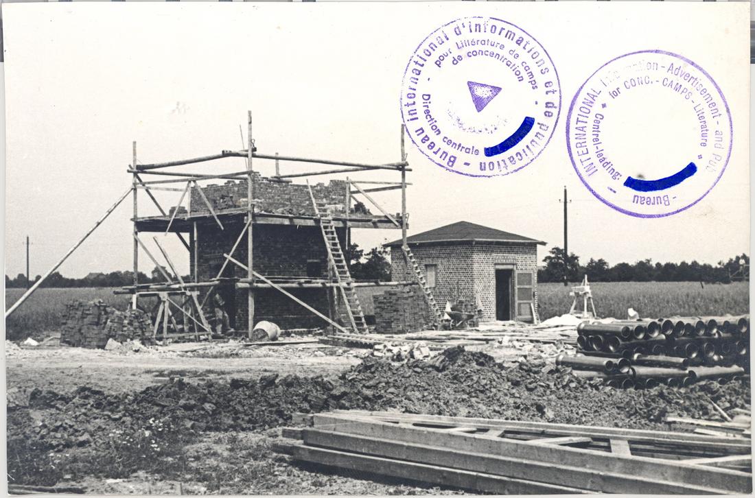 Aufbau des Transformatorenturms im späteren SS-Garagenhof. Rechts das Technikgebäude der Tankstelle und Abflussrohre aus Steinzeug für die Kanalisation, im Vordergrund vorgefertigte Dachbalken von Normbaracken. SS-Foto aus dem so genannten Masset-Album, nicht datiert. (ANg)