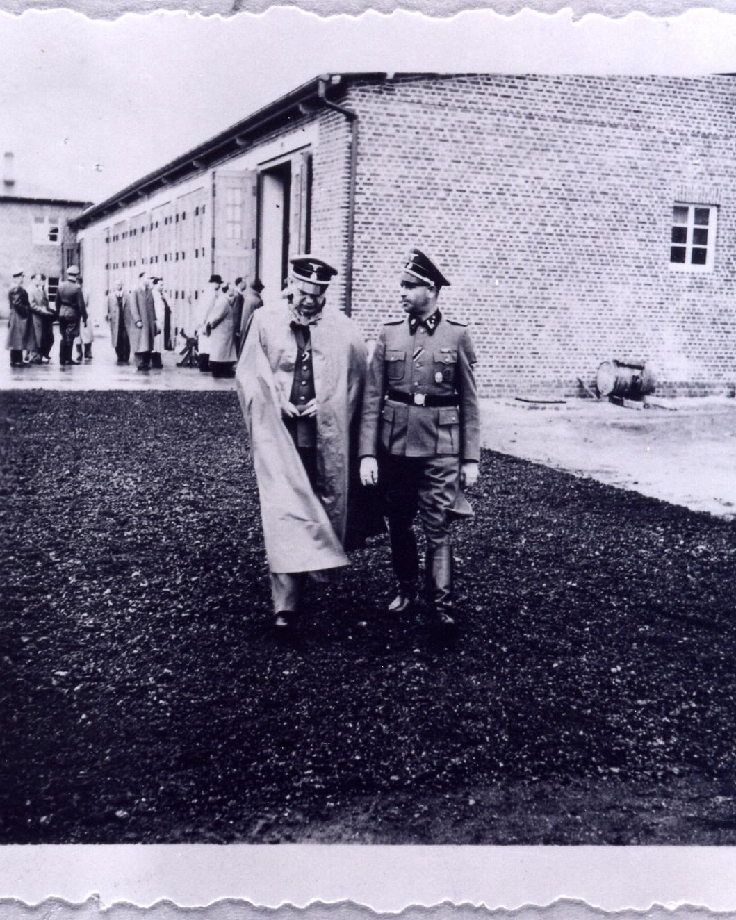 Die großen SS-Garagen nach ihrer Fertigstellung. Zusammen mit dem Höheren SS- und Polizeiführer Querner (im Vordergrund) besichtigt eine Gruppe von SS-Angehörigen und Zivilisten die Garagen. SS-Foto, nicht datiert. (BA BDC)