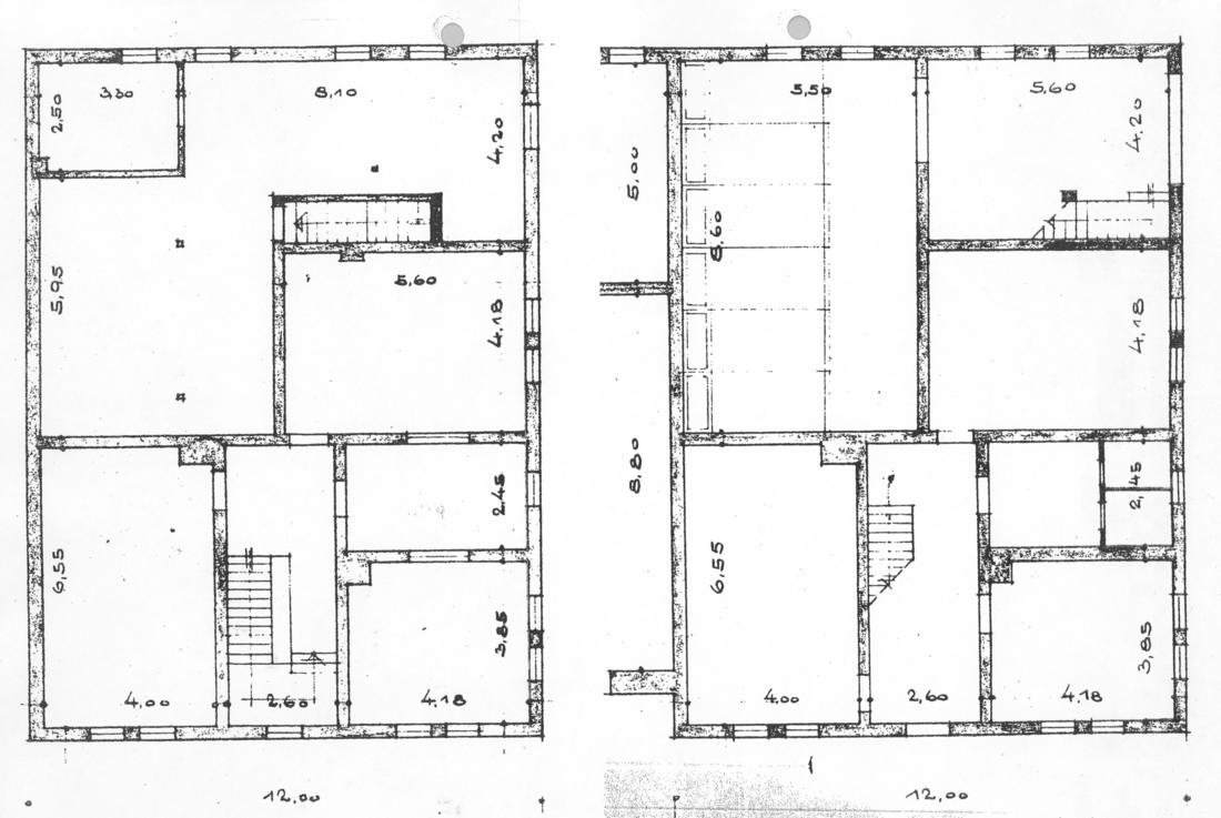 Erd- und Obergeschossgrundrisse des Pferdestalls. Im Erdgeschoss (links) sind in dem nordöstlichen Raum (oben links) sechs Pferdeboxen erkennbar. Der Zugang in den Stall erfolgte durch ein zweiflügeliges Tor (oben rechts). Hier befand sich auch ein Zugang zum Heuboden. Plan: vermutlich Hamburger Gefängnisbehörde für eine Bestandsaufnahme unmittelbar nach der Übernahme des britischen Internierungslagers CIC 6, nicht datiert. (JbH)