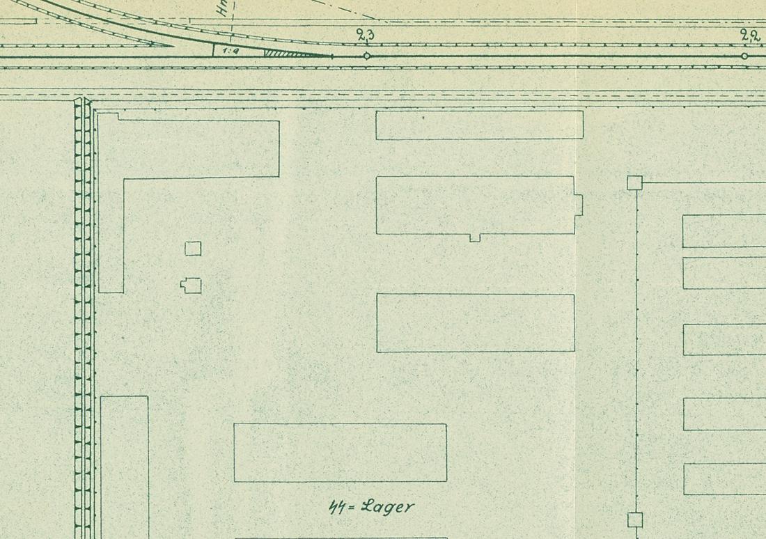 Auszug aus einem Lageplan für einen Gleisanschluss durch die Bergedorf-Geesthachter Eisenbahn AG (BGE). In dem dargestellten Bereich des SS-Lagers oben rechts sind die schmale SS-Küche und darunter die SS-Kantine erkennbar. Plan: BGE, April 1941. (ANg)