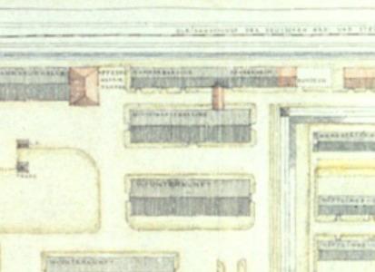 Auszug aus einem Lageplan des KZ Neuengamme. Die rot gekennzeichneten Bereiche markieren geplante Änderungen. Bei der Küchenbaracke ist hier südlich ein längerer Anbau als bestehend eingetragen, der nicht existierte. Nach diesem Entwurf war lediglich die Erweiterung um einen Hundezwinger geplant. Plan: Amtsgruppe C im SS-Wirtschafts-Verwaltungshauptamt, 3.3.1942. (CChIDK)