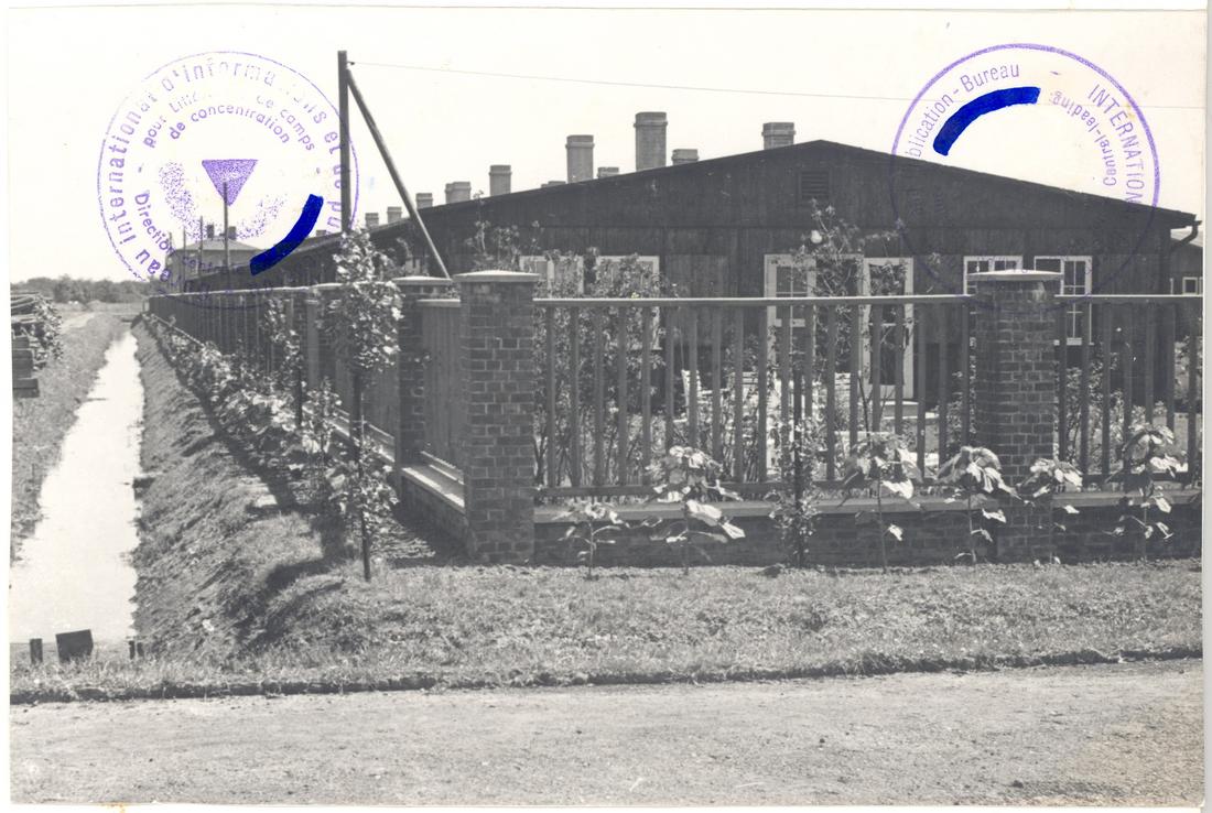 Westliche Ansicht der SS-Unterführer-Baracke. Die zweiflügelige Eingangstür führte in den am Neuen Heerweg (heute Jean-Dolidier-Weg) gelegenen Garten. Die Baracke grenzte noch direkt an den später verlegten Holzzaun. Im Hintergrund sind die kleinen SS-Garagen zu erkennen. SS-Foto aus dem so genannten Masset-Album, nicht datiert. (ANg)