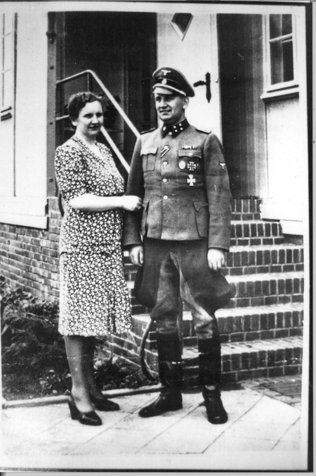 Der Kommandant des KZ Neuengamme, SS-Sturmbannführer Max Pauly, mit seiner Schwägerin vor dem Eingang in das Kommandantenhaus. SS-Foto, nicht datiert. (ANg)